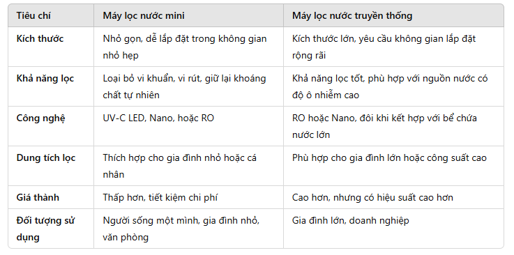 Máy lọc nước mini phù hợp với không gian sống nhỏ gọn và nhu cầu sử dụng cá nhân, trong khi máy lọc nước truyền thống là lựa chọn tối ưu cho gia đình lớn và nguồn nước đầu vào có độ ô nhiễm cao. Hãy xác định rõ nhu cầu của mình để lựa chọn sản phẩm phù hợp nhất!